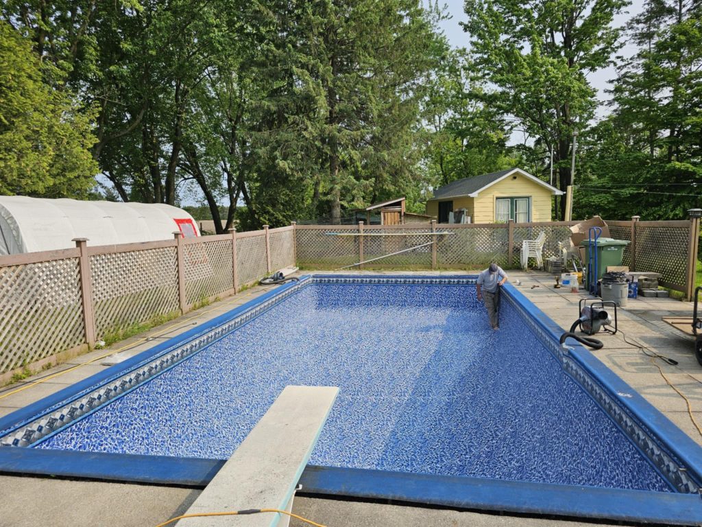 Nous enlevons la toile actuelle et effectuons les réparations mineures sur la structure de la piscine au besoin. Nous installons ensuite la nouvelle toile. Pendant le remplissage de la piscine, des ventilateurs seront installés pour aspirer l’air entre la toile et les parois de la piscine dans le but d’éviter les plis .